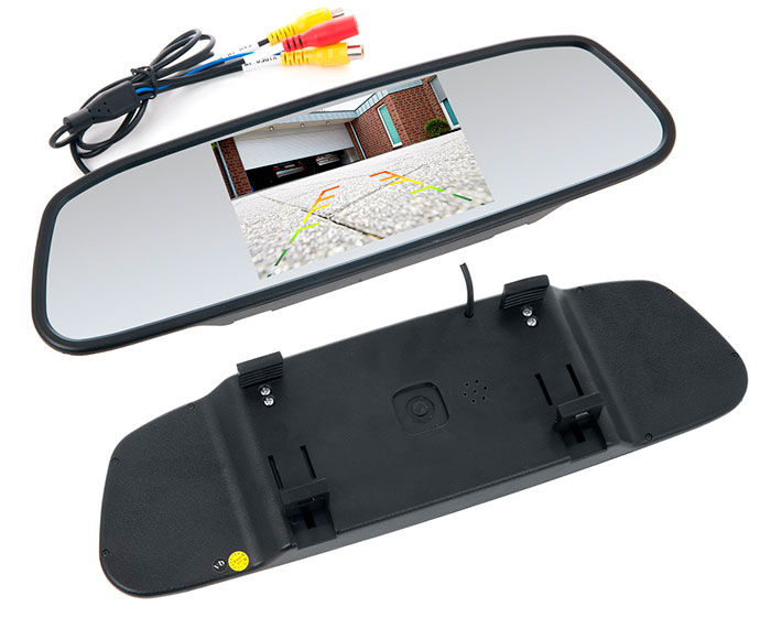 Накладка на автозеркало заднего вида имеет жидкокристаллический экран с диагональю 5 дюймов. На компактный LED-дисплей выводится изображение со штатной автомобильной камеры или установленной владельцем ТС дополнительно. Максимальное разрешение изображения– 800 на 480 пикселей.